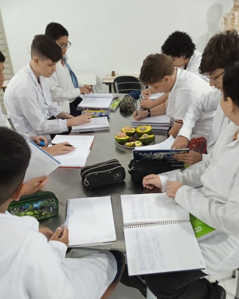 Prática 7°ano – Observação das diferentes camadas do interior da Terra com o auxílio de frutas, os alunos puderam reconhecer e caracterizar as referidas camadas.