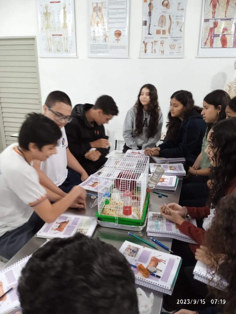 Alunos do 8°ano no laboratório da escola realizando uma prática de observação de roedores, uma das classes dos mamíferos.