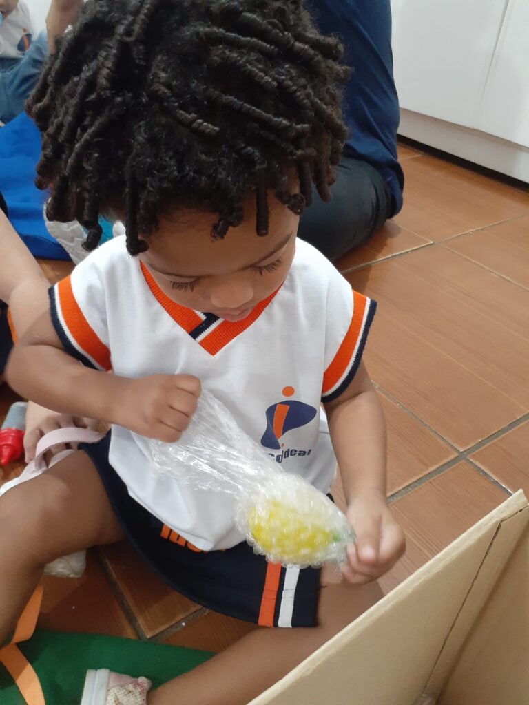 Maternal trabalhando com plástico bolha. Estimula a percepção visual, atenção e concentração. Auxilia também na percepção do tato, texturas e som, além da motricidade fina. Outra função é despertar o gosto pela arte. Sexta-feira também é dia dos brinquedos, para brincar e dividir com os colegas, importante para a socialização e emoções dos pequenos.