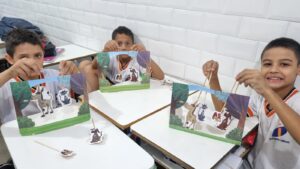 Os alunos do 5° ano trabalhando o gênero textual fábula. O conteúdo partiu do concreto pedagógico para o lúdico, com a confecção de um cenário