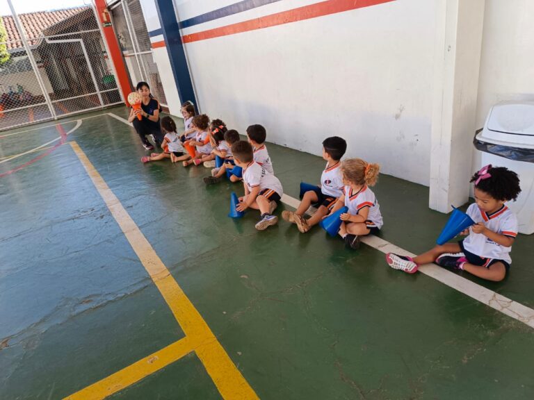 O Maternal foi para quadra trabalhar a coordenação motora, equilíbrio, agilidade e noção espacial.